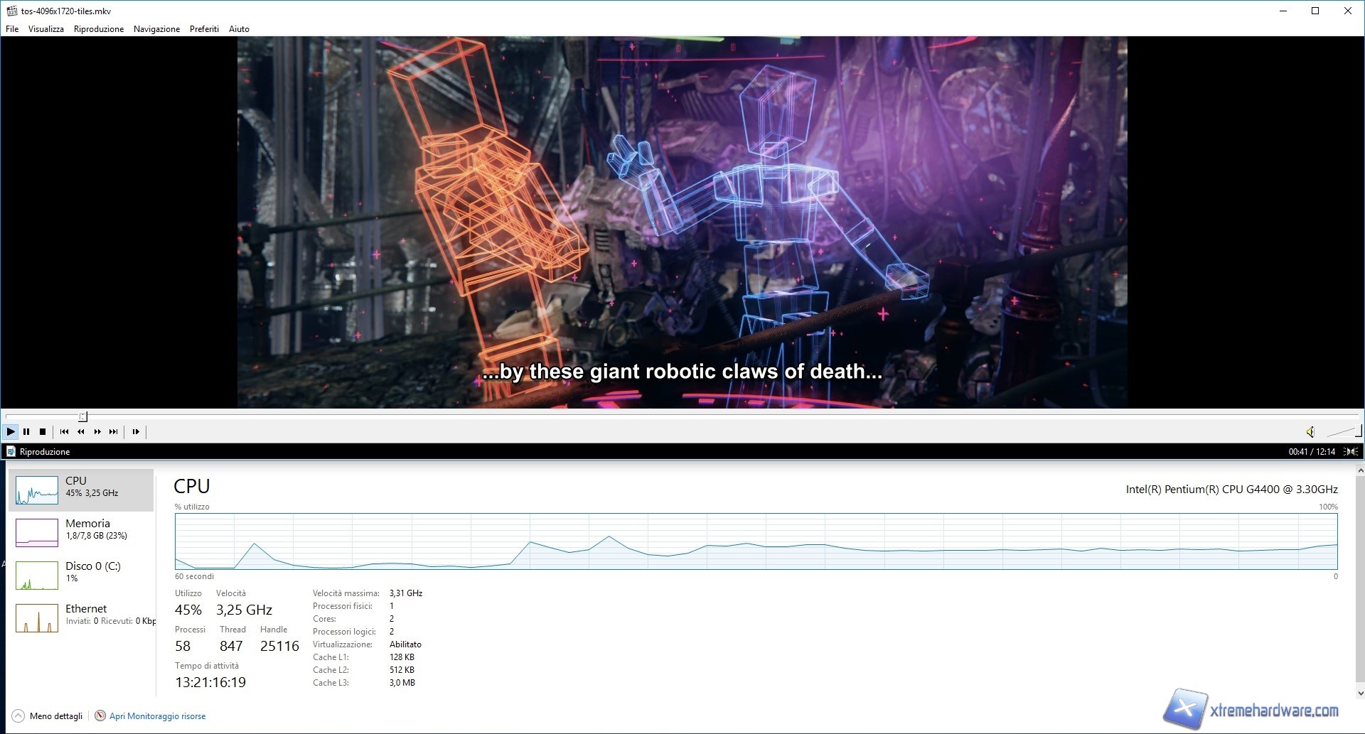 Notiamo come la riproduzione è stata eseguita con una percentuale di carico per la CPU di 10% e frequenza di 1,9GHz durante la riproduzione del filmato in FHD con codec H.264 mentre siamo passati alla totale saturazione durante la riproduzione del video in 4K con codec H.265 avvertendo anche notevoli scatti. Ovviamente e come vediamo in questo caso abbiamo avuto un utilizzo del 99% alla frequenza massima di 3,28GHz. Notiamo altresì che per una riproduzione in altà qualità e alta risoluzione, come può essere un video o film in 4K con codec H.265, il Pentium G4400 non garantisca alcun valido risultato almeno con il software VLC. Infatti per controprova abbiamo utilizzato il software Media Player Classic chiamato anche MPC-HC e possiamo vedere come tutto sia cambiato. La riproduzione del file con codec H.264 ha restituito una percetuale di utilizzo del 5% con una frequenza di 0,89GHz mentre passando al file, con cui abbiamo avuto grossi problemi con VLC, abbiamo avuto valori di utilizzo del 45% con una frequenza di 3,25GHz. Comprendiamo dunque come in questo caso il Pentium G4400 offra valide prestazioni e i problemi sono stati causati da un problema software e non hardware. Consigliamo dunque agli utenti di utilizzare il software MPC-HC al posto di VLC, almeno per il momento.