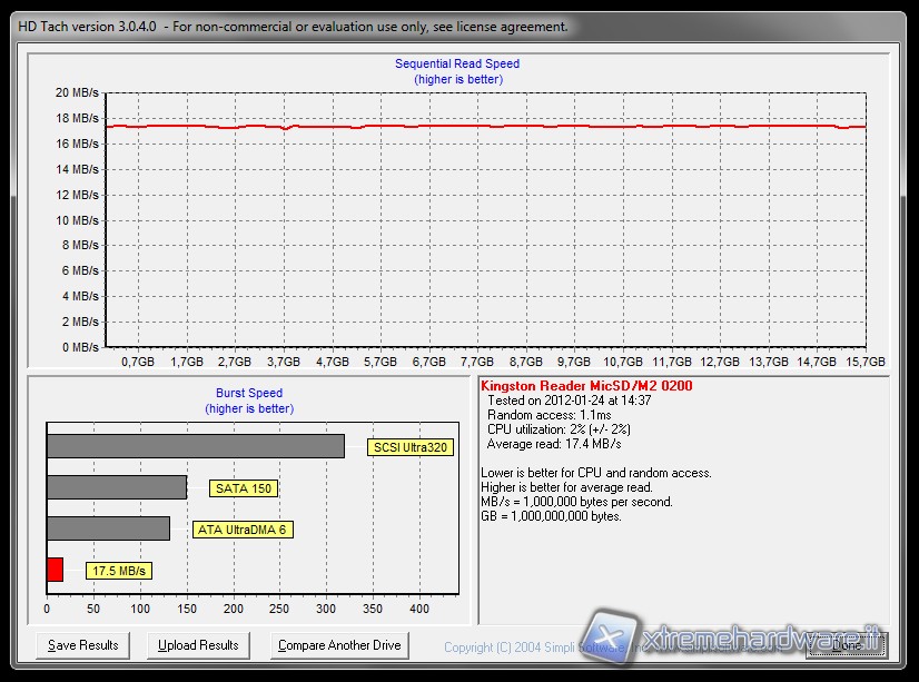HD Tach non fa altro che confermare i risultati ottenuti con HD Tune in presenza di dati sequenziali. La SDC4/16GB fa registrare risultati di poco superiori sia in termini di velocità di trasferimento, sia per quanto riguarda gli access time, anche se le differenze sono davvero minime.